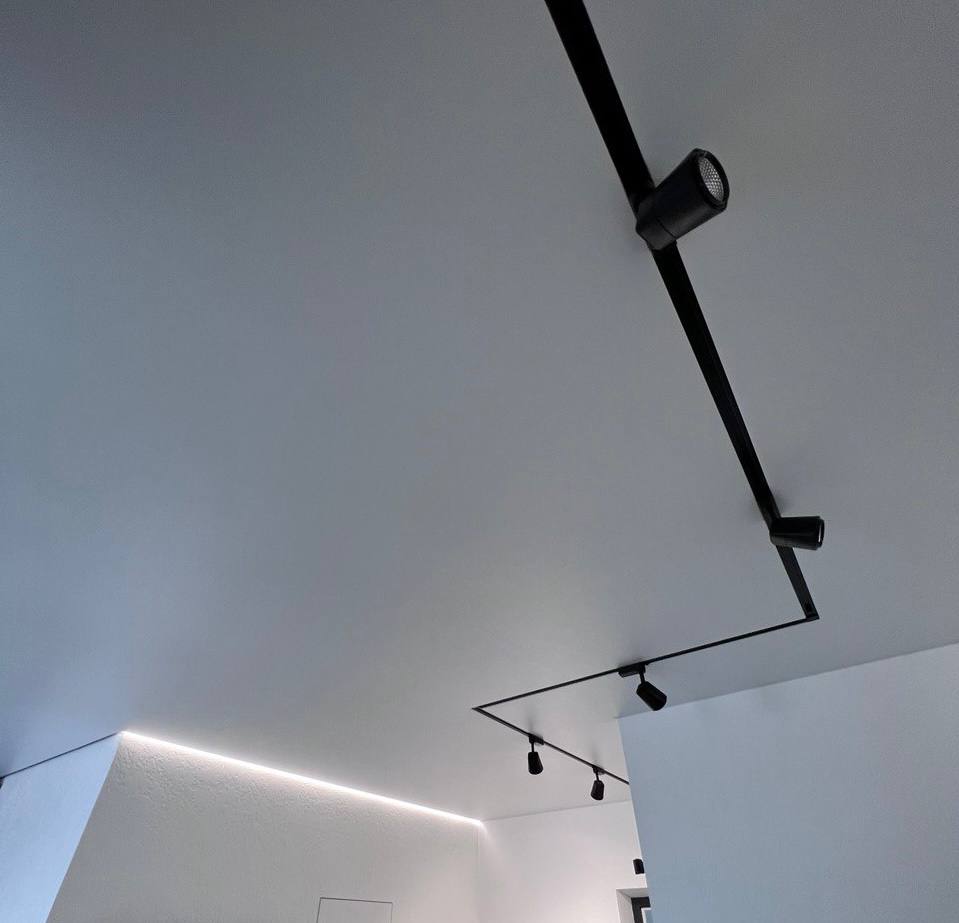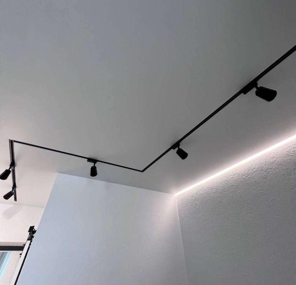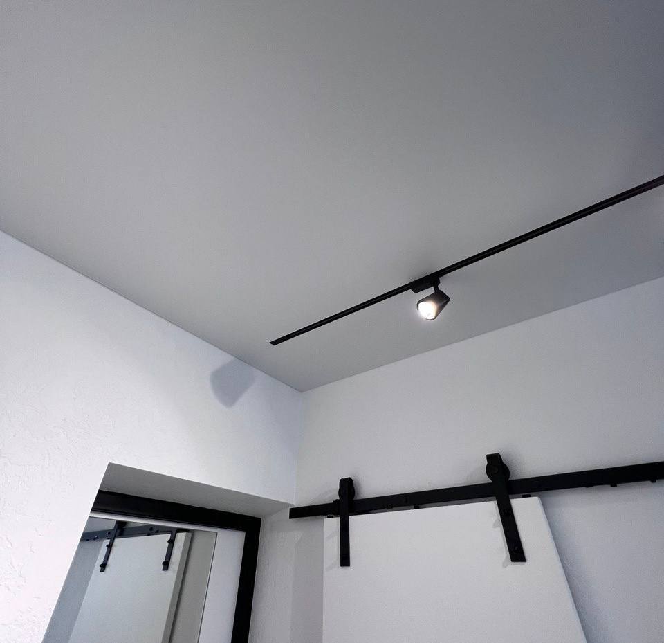 Освещение реализовано с помощью трековой системы, которая повторяет геометрию стен. Этот прием обеспечивает равномерное освещение всех зон прихожей и добавляет комнате современный и стильный вид.