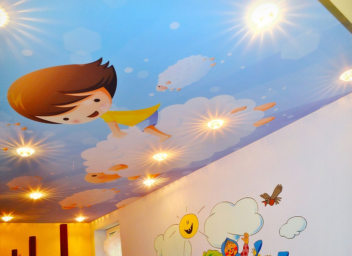 Поверхность натяжного потолка в детской комнате подсвечена 10 специальными светильниками. Монтаж потолка с 4 углами, площадью 12 кв. м был выполнен в течение 4 часов.
